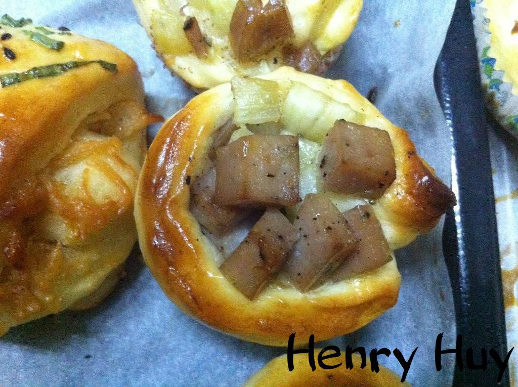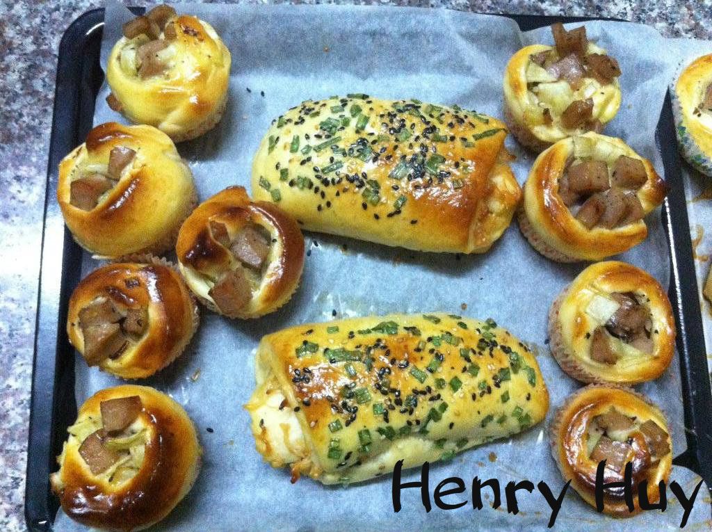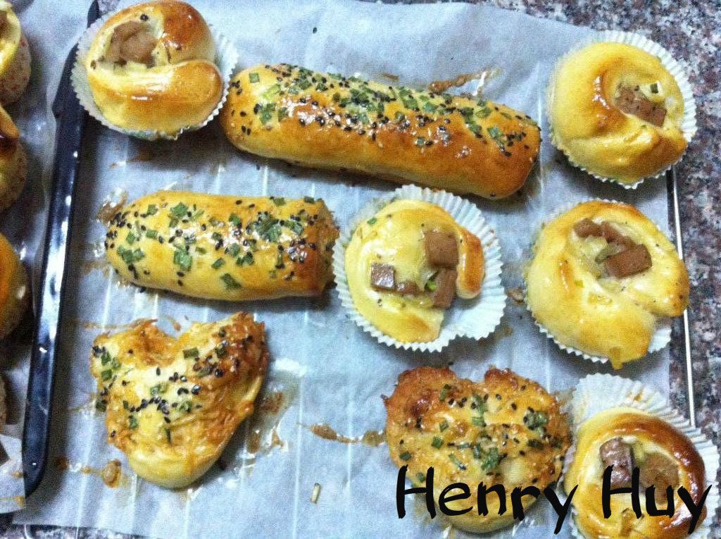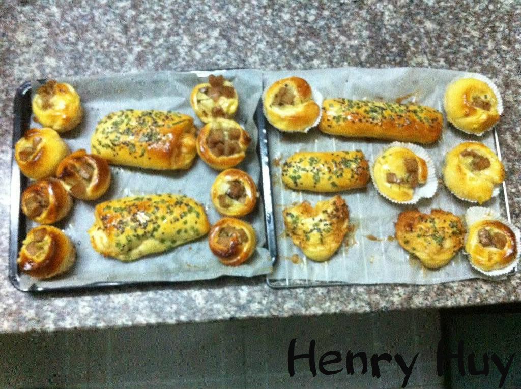 Đợt vừa rồi làm chả chưa thành công nên lần này làm bánh quyết định phải tiêu hủy hết chỗ chả trên, thế là có món bánh mì nhân chả lụa (nói chả lụa nghe cho xôm tụ chứ ba Henry bảo ăn giống xúc xích hơn).Còn dư 1 ít chà bông mua cho Henry ăn vậy là cũng lôi ra làm luôn cho hết, bánh mì nhân chà bông sốt mayonaise ra lò. Bánh làm xong cũng đã trễ nên chụp vội vội vàng vàng rồi tranh thủ đi ngủ sớm để ngày mai còn đưa Henry đi học.
