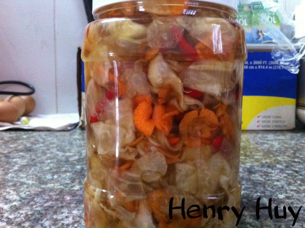 Gần sắp đến Tết nên mình tranh thủ thời gian lúc Henry còn đi học để làm các món ăn chơi trong mấy ngày Tết. Nhiều người nó sao mình làm sớm nhưng mà không làm sớm sao được còn biết bao nhiêu việc không tên đang chờ mình làm rồi mai mốt đây Henry mà nghỉ Tết ở nhà nữa là coi như xong khỏi làm gì hết, rút kinh nghiệm từ những cái Tết trước làm các món muối dưa chua, cà pháo, dưa món và củ kiệu xong thì ra Tết rồi mới được ăn còn mấy ngày trong Tết thì ngồi ngó cho tức mắt. Cải chua, cà pháo, dưa món thì nhanh nên mình làm trước còn củ kiệu thì chưa xong nên mình sẽ up hình sau.